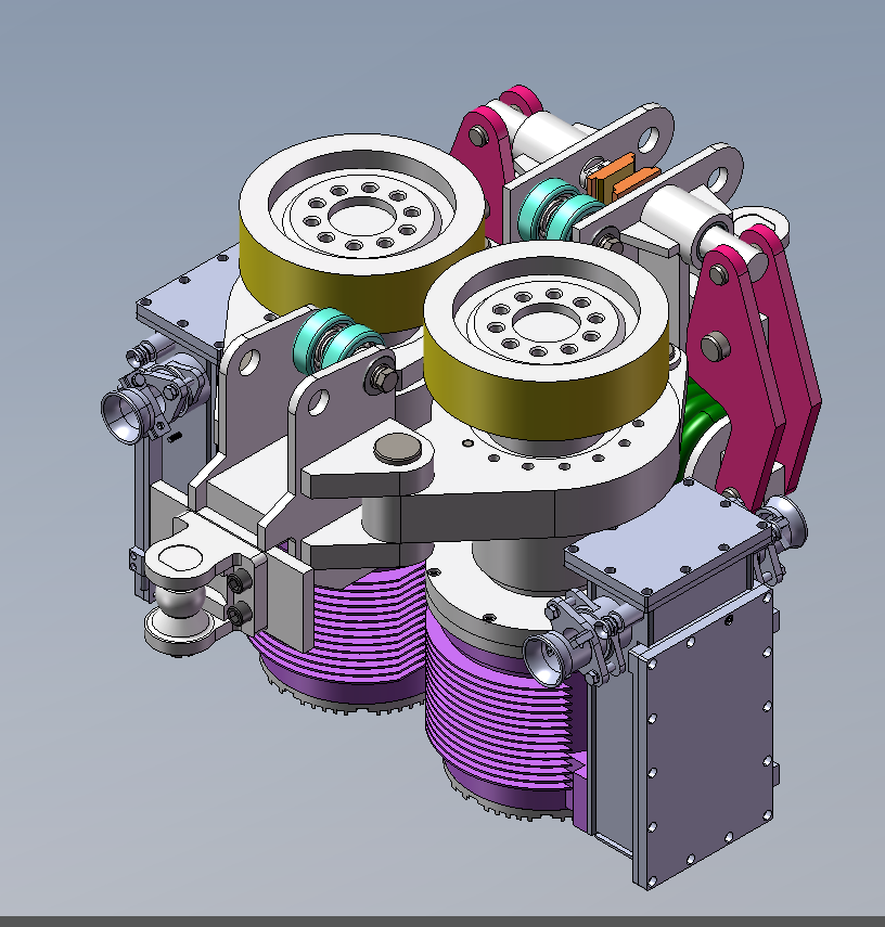 驅動部由永磁同步一體機、減速機、驅動輪、制動機構等組成。每臺驅動一體機內置對變頻器溫度檢測,主電閉合、斷開,電機繞組溫度,電機速度實時單獨檢測,有效保護每臺變頻器、電機,并實時提供給主控系統(tǒng)信息,供判斷與控制,方便每臺一體機單獨出力、單獨投入與退出。